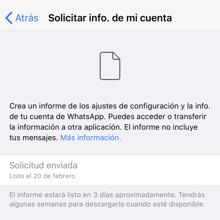 La función se encuentra disponible para las versiones de Android y iOS desde «Configuración». Dentro hay que acceder al apartado «Solicitar información de mi cuenta». Entonces, es necesario pinchar en «Solicitar informe», con lo que una vez pulsado aparecerá «Solicitud enviada». El sistema informará a los usuario que recibirá el informe en un plazo máximo de tres días. Cabe recordar, y así lo sugiere el propio servicio, que durante el tiempo de espera la solicitud puede ser cancelada si se realizan algunas acciones como eliminar la cuenta, cambiar de número o dispositivo.